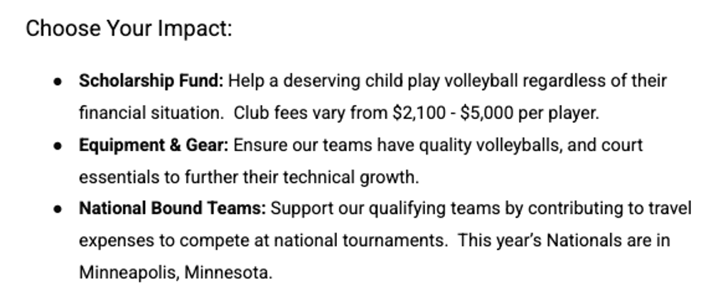 Support our non-profit volleyball club and empower young athletes to play, learn, and compete. Your donation provides vital support, removes financial barriers, and helps us build character and foster teamwork in our community.